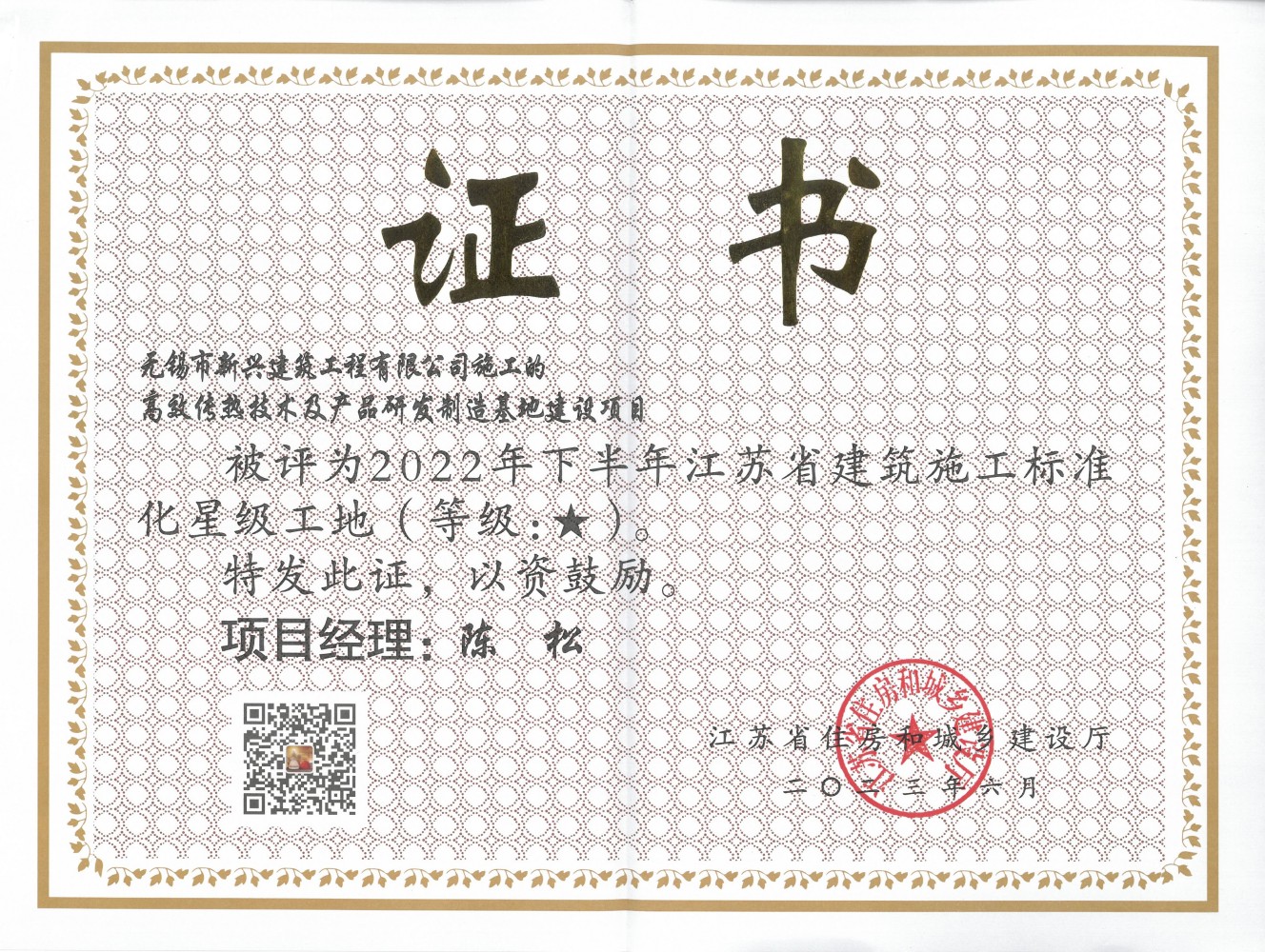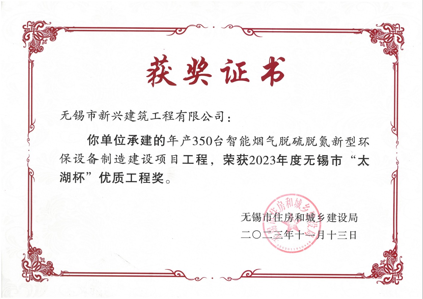 2023.11 新興建筑公司智能煙氣工程2023年度無錫市太湖杯優(yōu)質(zhì)工程獎